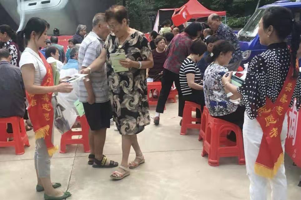 演出活動(dòng)中,襄沙化工廠和社區(qū)工作人員向觀眾發(fā)放創(chuàng)城和禁毒宣傳資料。